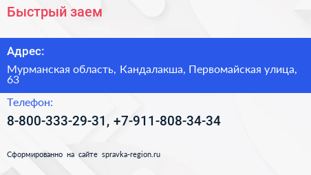 Быстрый заем по адресу Мурманская область, Кандалакша, Первомайская улица, 63 в дальнейшем Организация, размещена в следующих категориях: