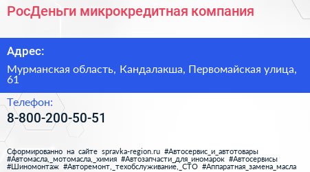 РосДеньги, микрокредитная компания по адресу Мурманская область, Кандалакша, Первомайская улица, 61 в дальнейшем Организация, размещена в следующих категориях: