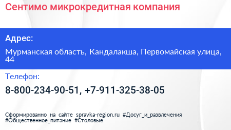 Сентимо, микрокредитная компания по адресу Мурманская область, Кандалакша, Первомайская улица, 44 в дальнейшем Организация, размещена в следующих категориях: