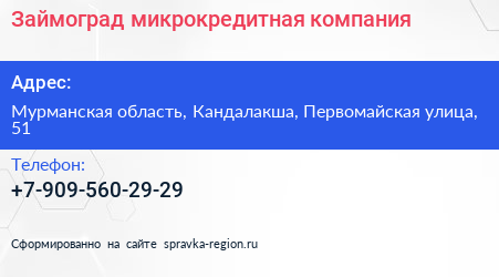 Займоград, микрокредитная компания по адресу Мурманская область, Кандалакша, Первомайская улица, 51 в дальнейшем Организация, размещена в следующих категориях: