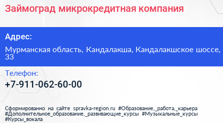 Займоград, микрокредитная компания по адресу Мурманская область, Кандалакша, Кандалакшское шоссе, 33 в дальнейшем Организация, размещена в следующих категориях: