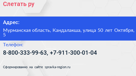 Слетать.ру по адресу Мурманская область, Кандалакша, улица 50 лет Октября, 5 в дальнейшем Организация, размещена в следующих категориях: