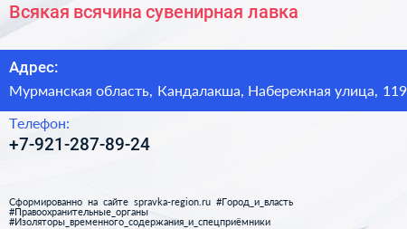 Всякая всячина, сувенирная лавка по адресу Мурманская область, Кандалакша, Набережная улица, 119 в дальнейшем Организация, размещена в следующих категориях: