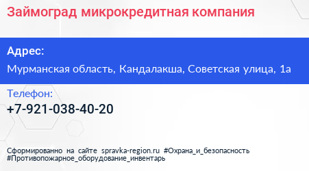 Займоград, микрокредитная компания по адресу Мурманская область, Кандалакша, Советская улица, 1а в дальнейшем Организация, размещена в следующих категориях: