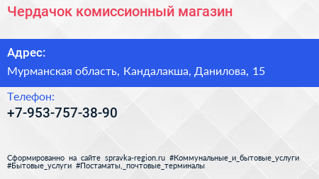 Чердачок, комиссионный магазин по адресу Мурманская область, Кандалакша, Данилова, 15 в дальнейшем Организация, размещена в следующих категориях: