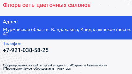 Флора, сеть цветочных салонов по адресу Мурманская область, Кандалакша, Кандалакшское шоссе, 40 в дальнейшем Организация, размещена в следующих категориях: