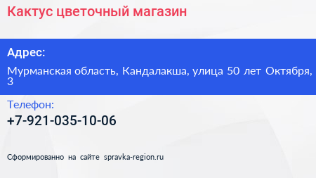 Кактус, цветочный магазин по адресу Мурманская область, Кандалакша, улица 50 лет Октября, 3 в дальнейшем Организация, размещена в следующих категориях: