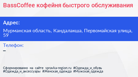 BassCoffee, кофейня быстрого обслуживания по адресу Мурманская область, Кандалакша, Первомайская улица, 59 в дальнейшем Организация, размещена в следующих категориях: