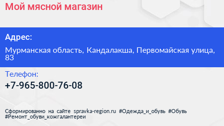 Мой мясной, магазин по адресу Мурманская область, Кандалакша, Первомайская улица, 83 в дальнейшем Организация, размещена в следующих категориях: