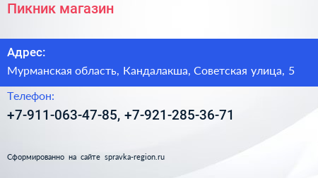 Пикник, магазин по адресу Мурманская область, Кандалакша, Советская улица, 5 в дальнейшем Организация, размещена в следующих категориях: