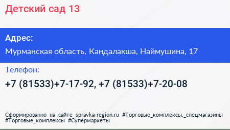 Детский сад №13 по адресу Мурманская область, Кандалакша, Наймушина, 17 в дальнейшем Организация, размещена в следующих категориях: