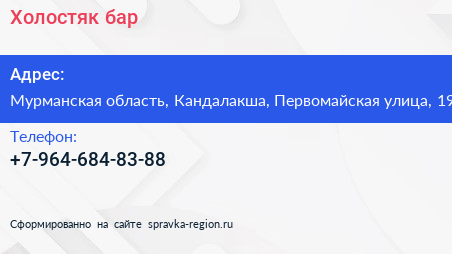 Холостяк, бар по адресу Мурманская область, Кандалакша, Первомайская улица, 19 в дальнейшем Организация, размещена в следующих категориях:
