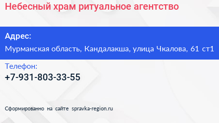 Небесный храм, ритуальное агентство по адресу Мурманская область, Кандалакша, улица Чкалова, 61 ст1 в дальнейшем Организация, размещена в следующих категориях:
