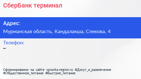 СберБанк, терминал по адресу Мурманская область, Кандалакша, Спекова, 4 в дальнейшем Организация, размещена в следующих категориях: