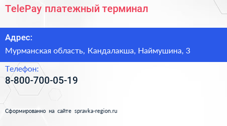 TelePay, платежный терминал по адресу Мурманская область, Кандалакша, Наймушина, 3 в дальнейшем Организация, размещена в следующих категориях: