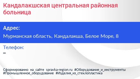 Кандалакшская центральная районная больница по адресу Мурманская область, Кандалакша, Белое Море, 8 в дальнейшем Организация, размещена в следующих категориях: