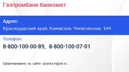 Газпромбанк, банкомат по адресу Краснодарский край, Каневская, Чипигинская, 144 в дальнейшем Организация, размещена в следующих категориях: