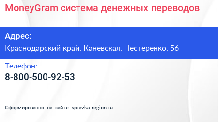 MoneyGram, система денежных переводов по адресу Краснодарский край, Каневская, Нестеренко, 56 в дальнейшем Организация, размещена в следующих категориях: