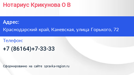 Нотариус Крикунова О.В. по адресу Краснодарский край, Каневская, улица Горького, 72 в дальнейшем Организация, размещена в следующих категориях: