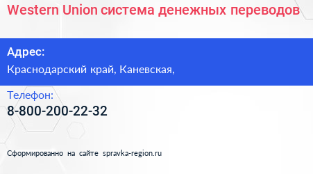 Western Union, система денежных переводов по адресу Краснодарский край, Каневская, в дальнейшем Организация, размещена в следующих категориях: