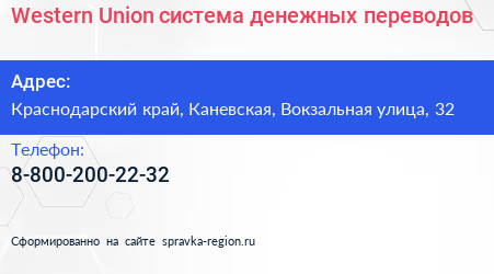 Western Union, система денежных переводов по адресу Краснодарский край, Каневская, Вокзальная улица, 32 в дальнейшем Организация, размещена в следующих категориях: