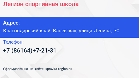 Легион, спортивная школа по адресу Краснодарский край, Каневская, улица Ленина, 70 в дальнейшем Организация, размещена в следующих категориях: