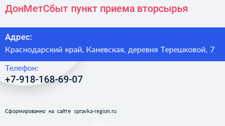 ДонМетСбыт, пункт приема вторсырья по адресу Краснодарский край, Каневская, деревня Терешковой, 7 в дальнейшем Организация, размещена в следующих категориях: