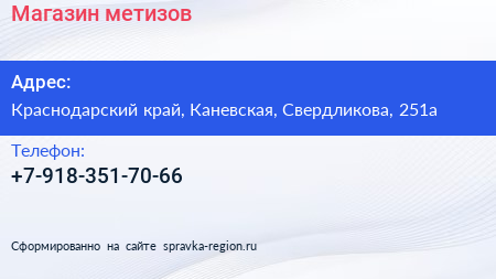 Магазин метизов по адресу Краснодарский край, Каневская, Свердликова, 251а в дальнейшем Организация, размещена в следующих категориях:
