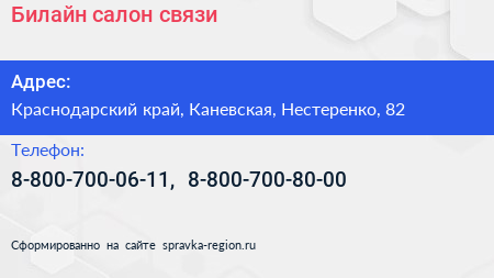 Билайн, салон связи по адресу Краснодарский край, Каневская, Нестеренко, 82 в дальнейшем Организация, размещена в следующих категориях: