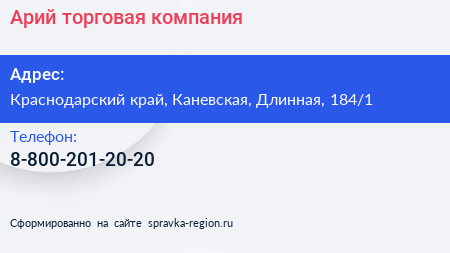 Арий, торговая компания по адресу Краснодарский край, Каневская, Длинная, 184/1 в дальнейшем Организация, размещена в следующих категориях: