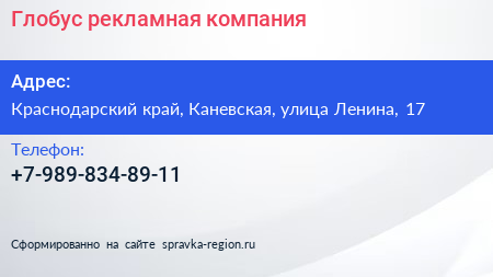 Глобус, рекламная компания по адресу Краснодарский край, Каневская, улица Ленина, 17 в дальнейшем Организация, размещена в следующих категориях: