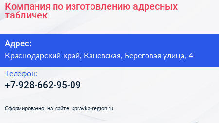 Компания по изготовлению адресных табличек по адресу Краснодарский край, Каневская, Береговая улица, 4 в дальнейшем Организация, размещена в следующих категориях: