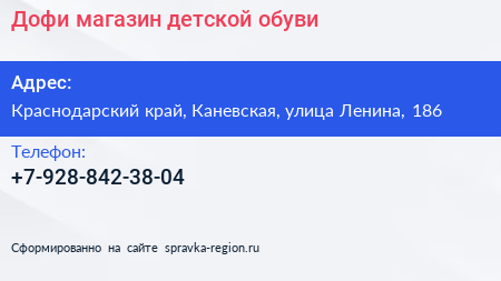Дофи, магазин детской обуви по адресу Краснодарский край, Каневская, улица Ленина, 186 в дальнейшем Организация, размещена в следующих категориях: