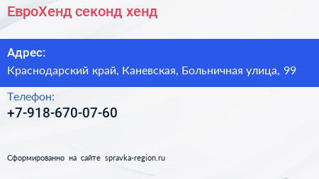 ЕвроХенд, секонд-хенд по адресу Краснодарский край, Каневская, Больничная улица, 99 в дальнейшем Организация, размещена в следующих категориях: