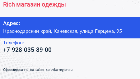 Rich, магазин одежды по адресу Краснодарский край, Каневская, улица Герцена, 95 в дальнейшем Организация, размещена в следующих категориях:
