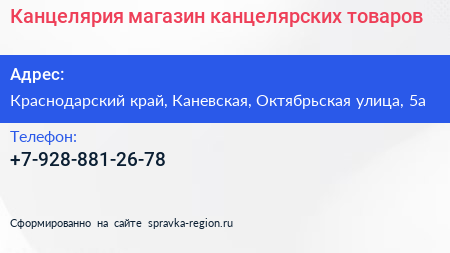 Канцелярия, магазин канцелярских товаров по адресу Краснодарский край, Каневская, Октябрьская улица, 5а в дальнейшем Организация, размещена в следующих категориях: