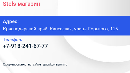 Stels, магазин по адресу Краснодарский край, Каневская, улица Горького, 115 в дальнейшем Организация, размещена в следующих категориях: