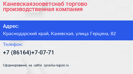 Каневскаязооветснаб, торгово-производственная компания по адресу Краснодарский край, Каневская, улица Герцена, 82 в дальнейшем Организация, размещена в следующих категориях: