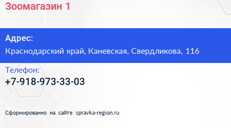 Зоомагазин №1 по адресу Краснодарский край, Каневская, Свердликова, 116 в дальнейшем Организация, размещена в следующих категориях: