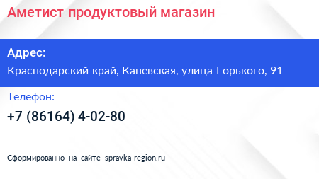 Аметист, продуктовый магазин по адресу Краснодарский край, Каневская, улица Горького, 91 в дальнейшем Организация, размещена в следующих категориях:
