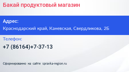 Бакай, продуктовый магазин по адресу Краснодарский край, Каневская, Свердликова, 2Б в дальнейшем Организация, размещена в следующих категориях: