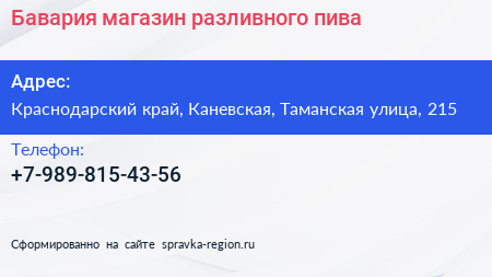 Бавария, магазин разливного пива по адресу Краснодарский край, Каневская, Таманская улица, 215 в дальнейшем Организация, размещена в следующих категориях: