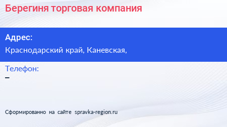 Берегиня, торговая компания по адресу Краснодарский край, Каневская, в дальнейшем Организация, размещена в следующих категориях: