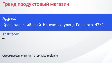 Гранд, продуктовый магазин по адресу Краснодарский край, Каневская, улица Горького, 47/2 в дальнейшем Организация, размещена в следующих категориях:
