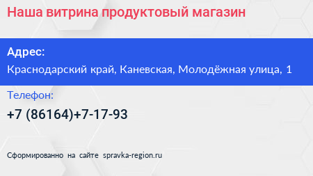 Наша витрина, продуктовый магазин по адресу Краснодарский край, Каневская, Молодёжная улица, 1 в дальнейшем Организация, размещена в следующих категориях: