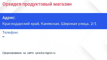 Орхидея, продуктовый магазин по адресу Краснодарский край, Каневская, Широкая улица, 2/1 в дальнейшем Организация, размещена в следующих категориях:
