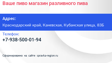 Ваше пиво, магазин разливного пива по адресу Краснодарский край, Каневская, Кубанская улица, 83Б в дальнейшем Организация, размещена в следующих категориях: