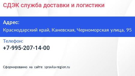СДЭК, служба доставки и логистики по адресу Краснодарский край, Каневская, Черноморская улица, 95 в дальнейшем Организация, размещена в следующих категориях: