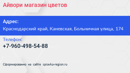 Айвори, магазин цветов по адресу Краснодарский край, Каневская, Больничная улица, 174 в дальнейшем Организация, размещена в следующих категориях: