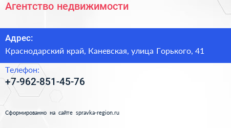 Агентство недвижимости по адресу Краснодарский край, Каневская, улица Горького, 41 в дальнейшем Организация, размещена в следующих категориях: